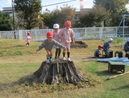肌寒い朝が過ぎると、日の当たる園庭では、のびやかに今日も体を動かして遊ぶ様子がありました。
