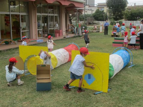3組がアイデアを出して進めているコースづくり。今日は、遊びの中で、2組や1組にも誘いかけて、お試しを楽しんでいました。