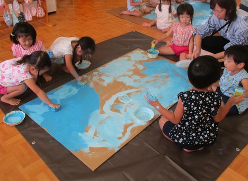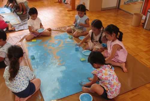 1組では最近、「あぶくたった」の童歌遊びを楽しんでいます。今日は、あぶくたったの「風の音」から連想して、スポンジと絵の具で色をつけることも楽しみました。風だけでなく、空、雨、海など、自然のイメージを広げていく言葉も聞かれました。
