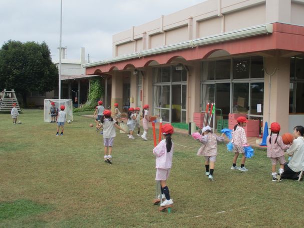 先日、浦和レッズのサッカー教室を体験したこともあり、ボールやゴールに関心をもつ人、ほかにも、フープ、竹馬、なわとびなどを試す姿がありました。