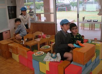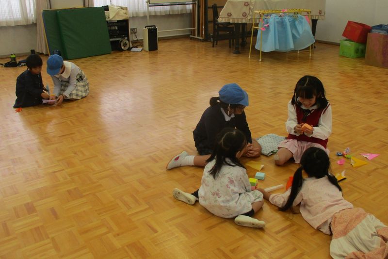 2組にも、別のクラスの4年生が幼稚園にやってきました。前回と同様、一緒に園内で楽しく遊ぶことができました。