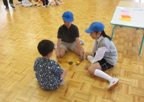 3組は、附属小学校に出かけて、4年生と一緒に遊びました。大きな体育館で、少し特別な気持ちで楽しむことかできました。
