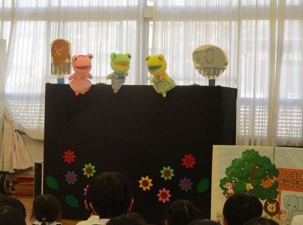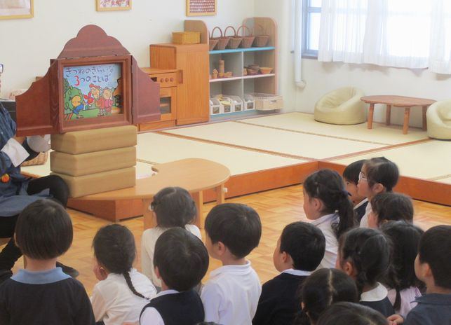 訓練の後には、2、3組は警察の方からお話や人形劇を見せてもらい、1組は紙芝居を見て、それぞれ大切なことを学びました。