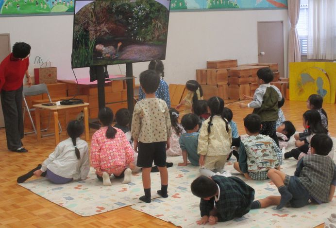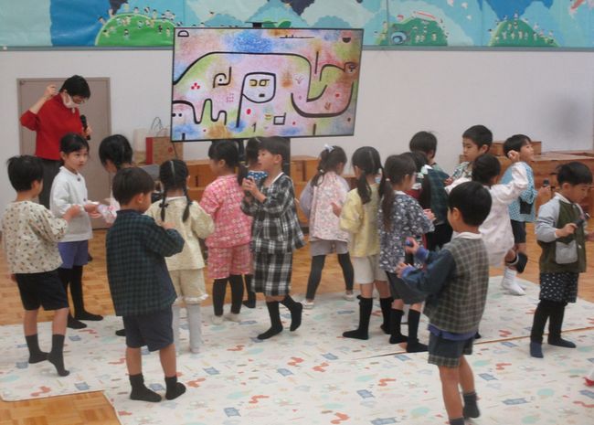 いろいろな名画の画像を大きなモニターで見ながら、感じたことを体で表したり、用意いただいた物を使って音で表したりして楽しみました。
