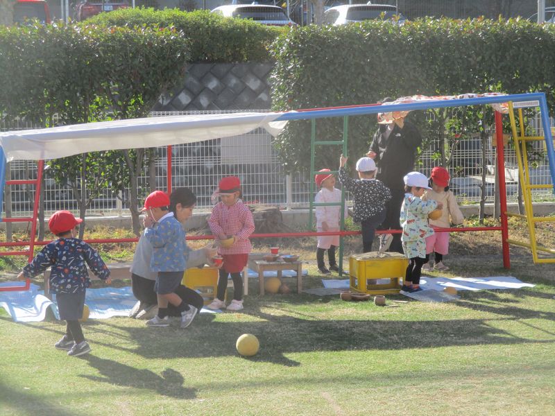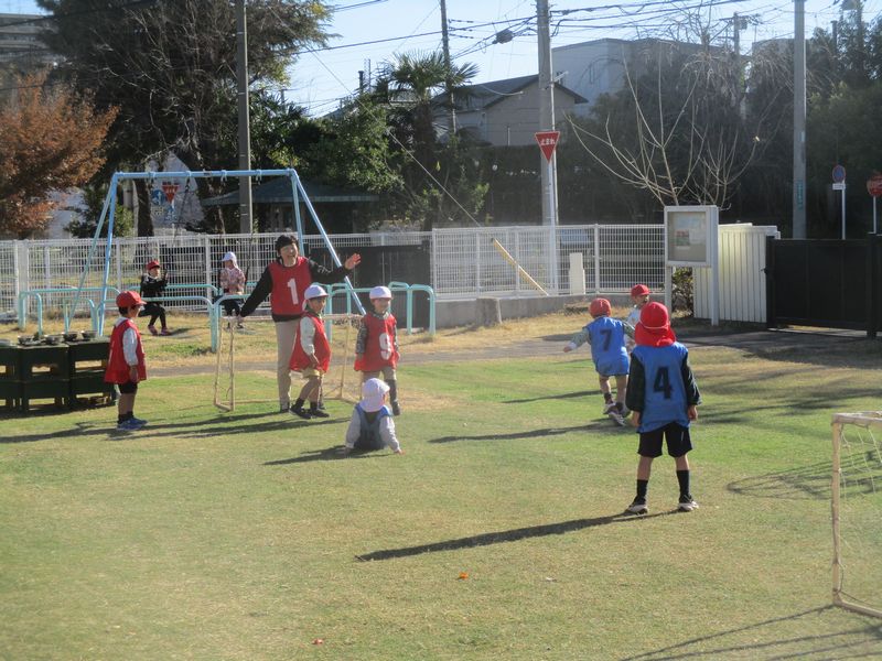 冷たい風が時折吹く中でも、園庭で遊ぶ姿は続いています。室内でのごっこ遊びや作る遊びなどとも行き来しながら、楽しんでいる様子です。