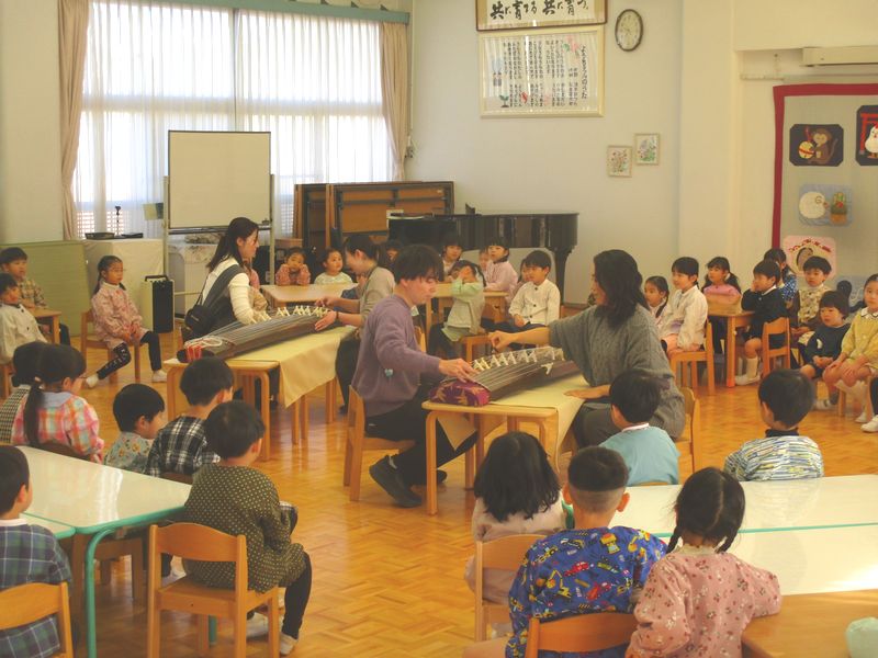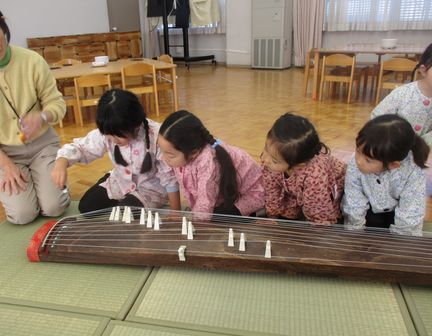 先生たちからは、箏(附属小からお借りしました)の演奏「さくら さくら」を聴かせてもらいました。こどもたちが実際にふれてみる姿もありました。