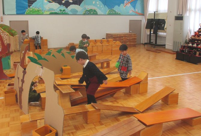雨の日は、保育室や遊戯室、テラスなどを使って遊びが始まります。遊戯室では、コマを進めるコースを作って楽しむ2組の人がいました。