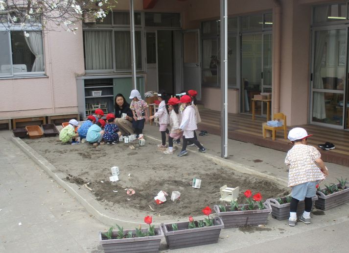 園庭で遊ぶ人が多く、砂場の「かきごおりやさん」、花壇近くの「カマキリハウス」など、楽しそうに名付けられた遊びも生まれていました。