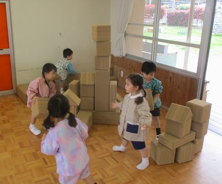 1組では、ままごと道具や大きな積み木など、室内にあるいろいろなものに目を向けて、さっそく遊んでみる姿がありました。