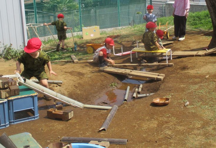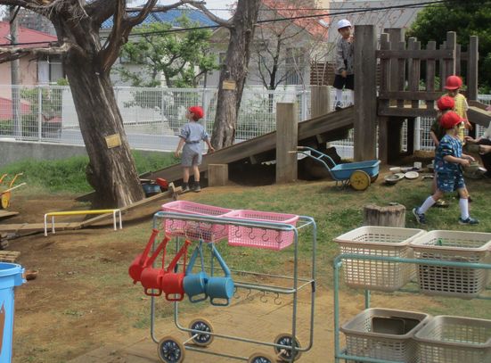 また、昨年までの年長の遊びに触れていたこともあり、築山や土の傾斜など、3組保育室の近くの場(空間)にも、わくわくしているようです。