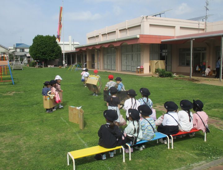 身支度を急いで終えた3組が、自分たちで段ボールを使って作った「タクシー」に入ります。そこにお客さんで待っている1組や2組の人を乗せて、それぞれのクラスの前まで連れて行ってくれます。