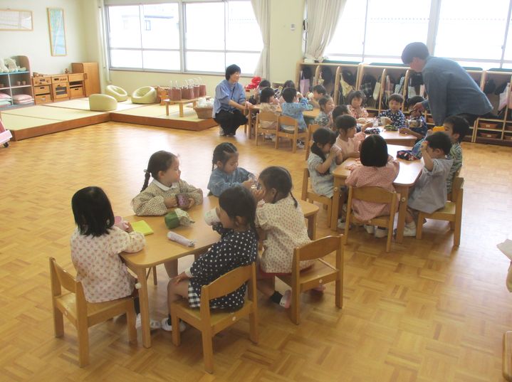 1組は、外でたくさん遊んだ後に、みんなで白湯を飲んでいます。ほっと一息つくひとときになっています。