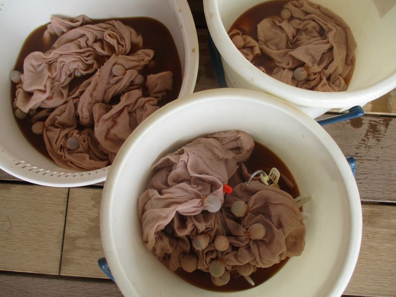 先週、グループごとにビー玉などで模様をつけておいたものを、小豆の煮汁に浸すと、素敵な色になりました。