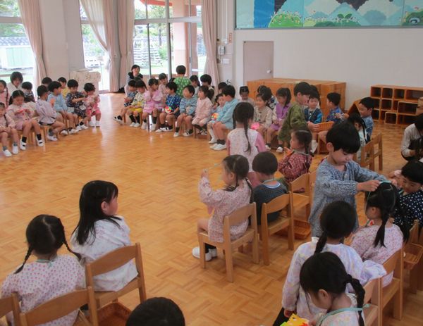 今年度初めてのこども会は、3組の人が心を込めて作ってくれた「ペンダント」を、1組と2組の人に渡してくれました。不思議なマントで動物になってしまった先生は誰か、こどもたちが当てるゲームも楽しみました。