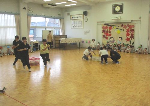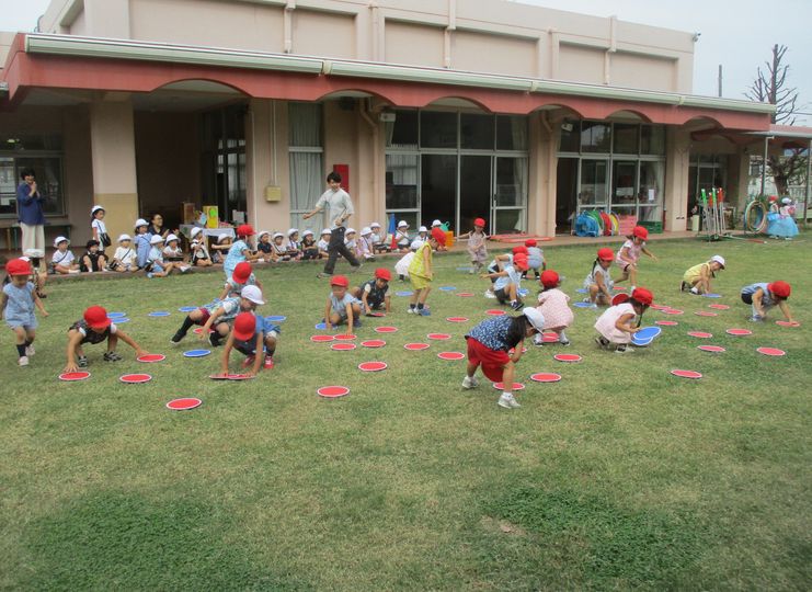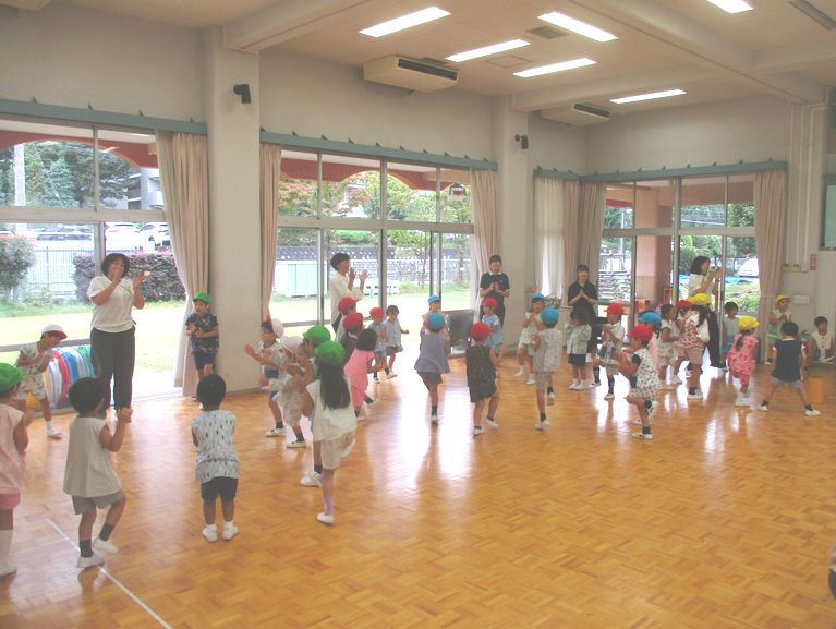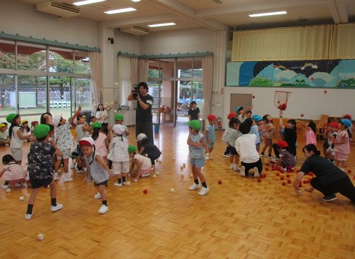 まず「はとぽっぽ体操」で体の準備をして、5つのチームで玉入れをしました。玉入れの片付け競争は、今日で実習が終わる実習生同士の対戦を、みんなで応援しました。