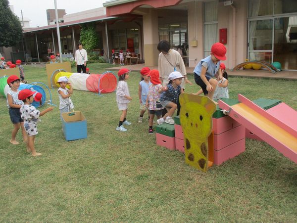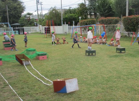 3組がアイデアを出して進めているコースづくり。今日は、遊びの中で、2組や1組にも誘いかけて、お試しを楽しんでいました。