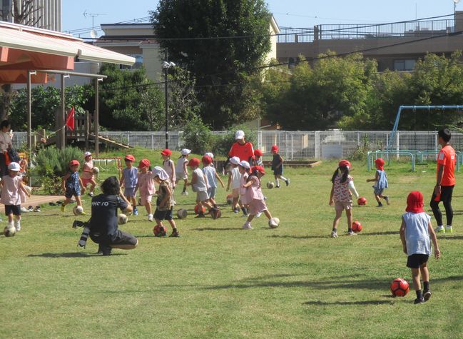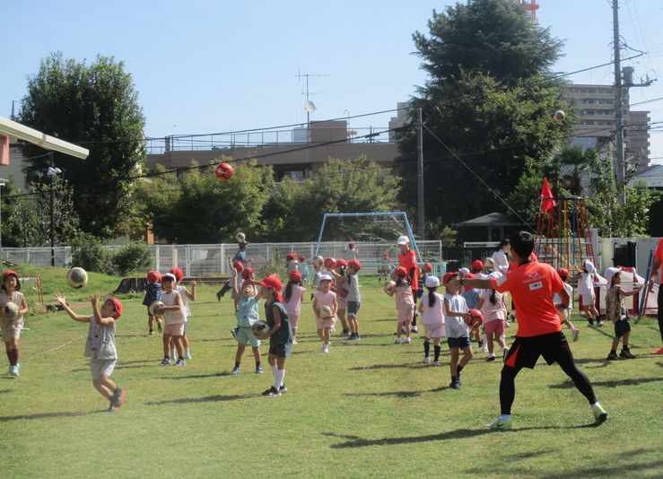 一人一つずつのボールで、いろいろな動きに挑戦した後、2つのチームに分かれての対戦もしました。