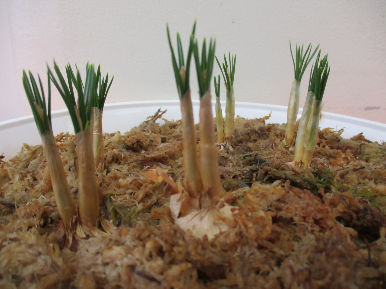 1組の保育室では、クロッカスを育てています。球根から可愛らしい芽が伸びてきています。