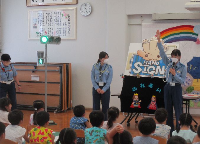 埼玉県警察本部のふれあい班の方、3名に来園いただき、「交通安全教室」を実施しました。クラスごとに、信号の色の意味や横断歩道の渡り方などを教えてもらいました。