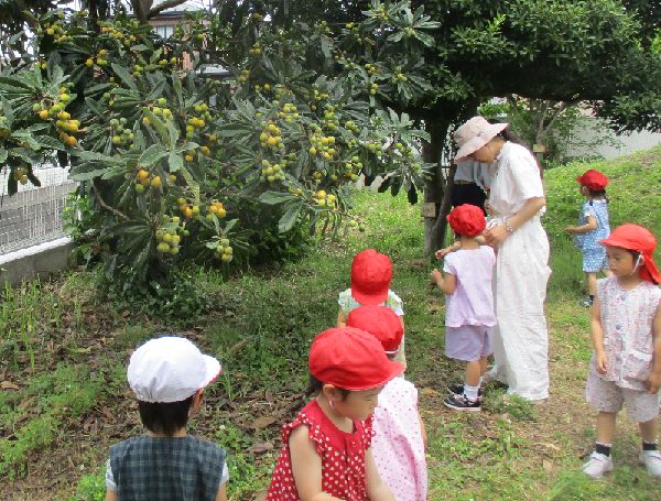 今週の保育が始まりました。2組は、お弁当の前の時間に、みんなで自然観察園で過ごしました。