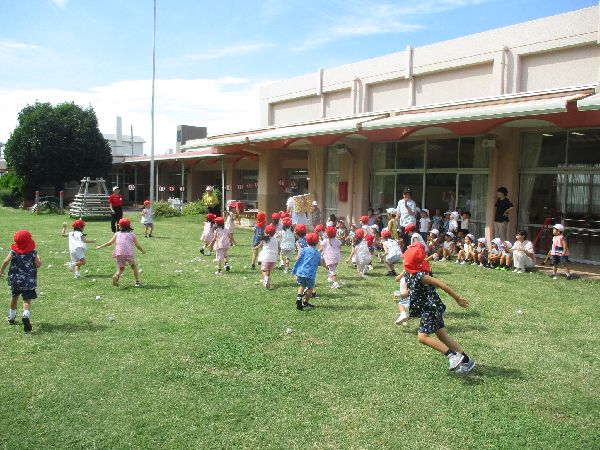 食後の時間には、今度は3組が昨日楽しんだ追いかけ玉入れに、2組も加わって一緒にやってみました。1組がここでもやってきて、応援していました。