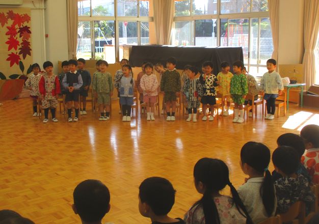 11月のこども会は「音楽」の会でした。それぞれのクラスから、クラスで楽しんでいる歌を1曲ずつ披露しました。