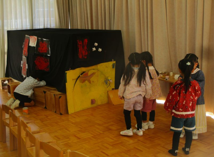 3組では、これからの冬にぴったりな作りかけの「編み物」がありました。遊戯室には、少しずつ作り加えている「お化け屋敷」が…、おどろおどろしさも素敵です。