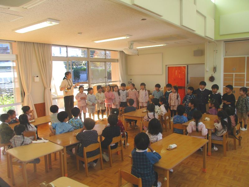 コツコツと作り進めた編み物を、マフラーやカチューシャなどにして「ファッションショー」です。順に登場し、揃ったところで、「あわてんぼうのサンタクロース」の歌と楽器の演奏も聴かせてくれました。1組、2組みんな、とても嬉しそうに見たり聴いたりしていました。