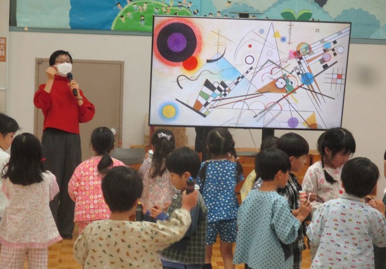 いろいろな名画の画像を大きなモニターで見ながら、感じたことを体で表したり、用意いただいた物を使って音で表したりして楽しみました。