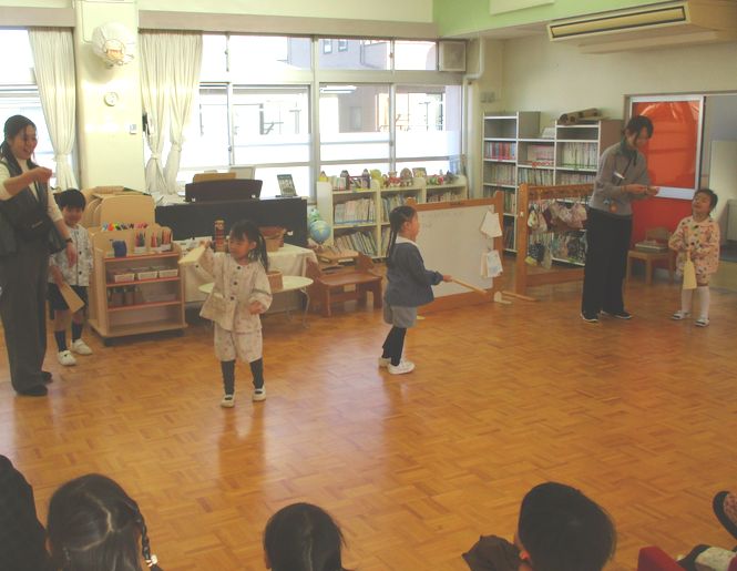 新年1月のこども会は、なかよしグループごとに、シールラリーをしました。部屋ごとに「なべなべそこぬけ」「はねつき」「コマ回し」を試していきました。