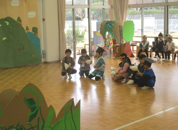 聞きなじみのある昔話から、登場する者になりきって動いてみたり、お話しの新たなすじや場面を発想して、言葉を紡いでみたりしています。
