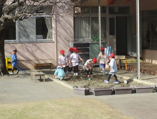 園庭では、仲間で誘い合って「くつとり鬼」をする3組の姿や、砂場に集まってきて遊ぶ姿がありました。