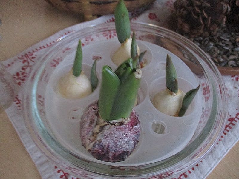 水栽培やプランターに植えた球根が、すくすく芽を出し、育っています。