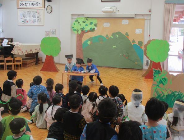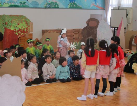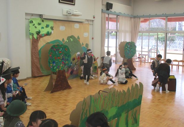 遊戯室には、各クラスで作り進めた大きなもの(劇の大道具など)がたくさんある中、それぞれの表現をしたり見合ったりしていました。