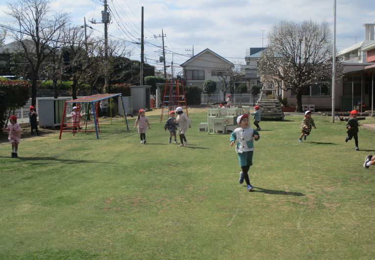 3組は食後に晴れ渡る園庭で、鬼遊びなどをしながら、思い切り駆け回る姿もありました。