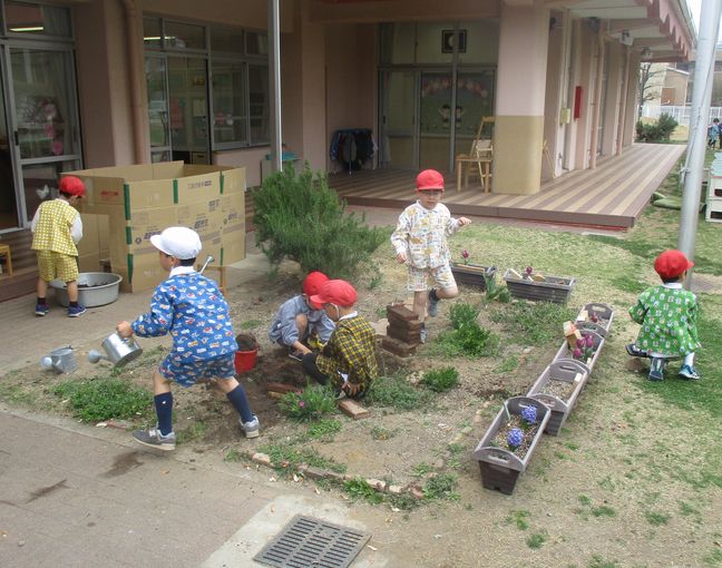 園庭で遊ぶ人が多く、砂場の「かきごおりやさん」、花壇近くの「カマキリハウス」など、楽しそうに名付けられた遊びも生まれていました。