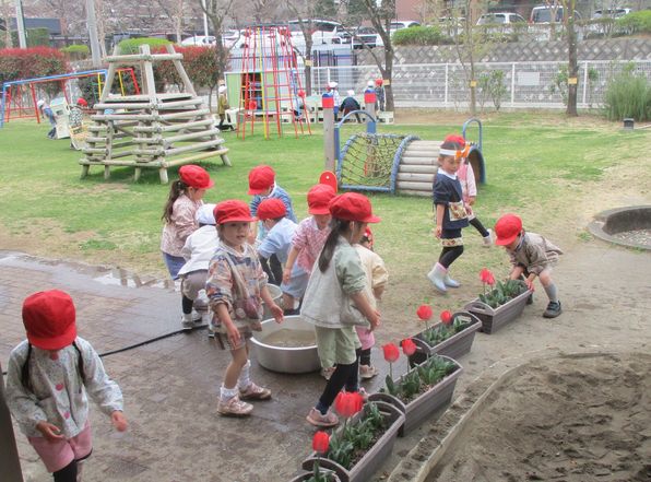 それぞれのクラスで使ってきた園庭用の遊具などを丁寧に、洗ったり、整えたりしました。