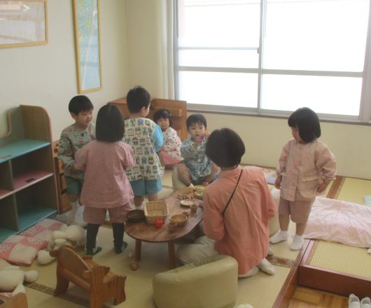 1組では、ままごと道具や大きな積み木など、室内にあるいろいろなものに目を向けて、さっそく遊んでみる姿がありました。