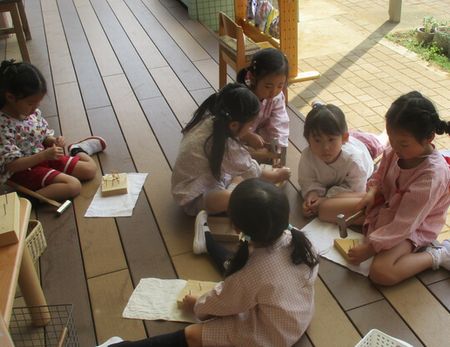 3組になって初めて見たり、手に取ったりする物(道具、遊具、材料)に、わくわくした気持ちな様子で使ってみる様子があります。