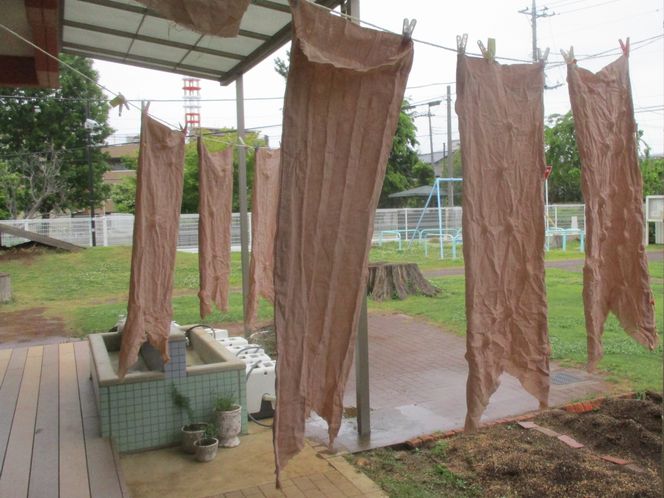 先週、グループごとにビー玉などで模様をつけておいたものを、小豆の煮汁に浸すと、素敵な色になりました。