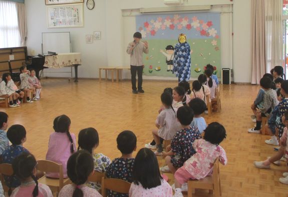 今年度初めてのこども会は、3組の人が心を込めて作ってくれた「ペンダント」を、1組と2組の人に渡してくれました。不思議なマントで動物になってしまった先生は誰か、こどもたちが当てるゲームも楽しみました。