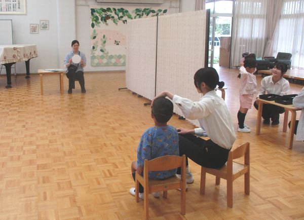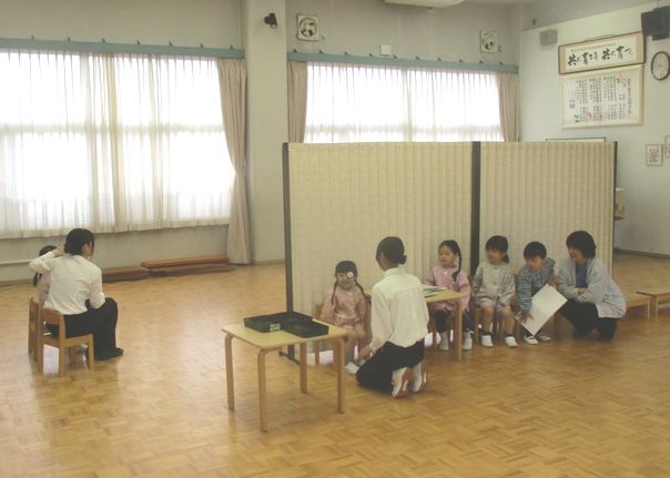 今日は、2組の視力検査を行いました。本園の養護教諭のほか、検査の補助に大学の先生(前園長先生)や学部学生(養護教諭養成課程)も加わってもらいました。